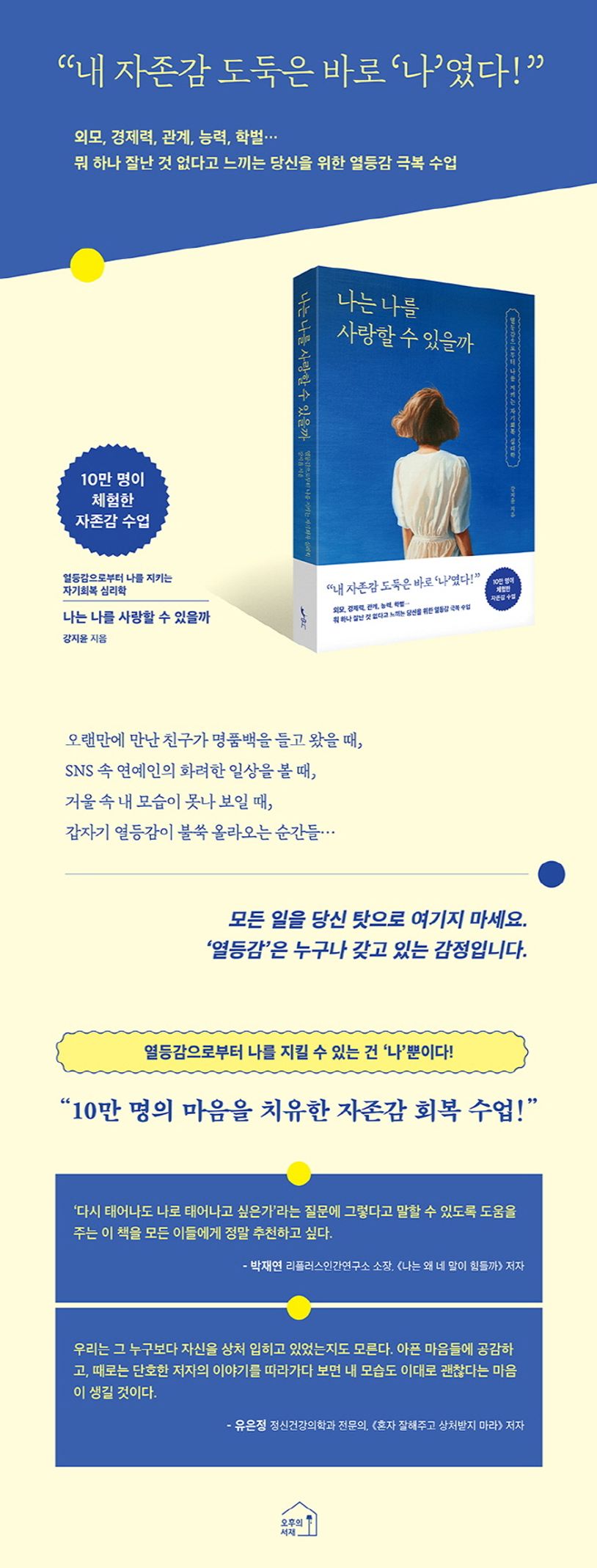 ‘우리 집은 남들보다 가난해’, ‘난 왜 이것밖에 되지 않는 걸까?’, ‘난 왜 이렇게 생긴 거야?’ 어디선가 많이 들어본 말들이지 않은가. 바로 나 자신으로부터 말이다. 우리는 살아가면서 다양한 부정적 감정에 시달린다. 특히 자신을 남과 비교하거나, 깎아내리고 상처 입히는 데서 생겨난 수치심은 스스로를 열등감의 나락으로 떨어뜨린다. ‘열등감’의 사전적 의미는 ‘자기를 남보다 못하거나 무가치한 인간으로 낮추어 평가하는 감정’이다. 결국 나의 인생을 다른 사람의 삶과 비교하는 과정에서 생겨나는 것이다. SNS 속 친구들의 일상이, 연예인들의 화려한 모습이, 나보다 훨씬 행복해 보이는 다른 이들의 삶이 불현듯 내 감정을 무너뜨린다. 《나는 나를 사랑할 수 있을까》의 저자 강지윤 박사는 내 열등감을 직시하는 것이 열등감 극복의 시작이라고 말한다. 그는 독자들이 자신의 열등감에서 벗어나 부디 자유롭고 행복한 삶을 살 수 있도록 돕는 마음으로 이 책을 썼다.