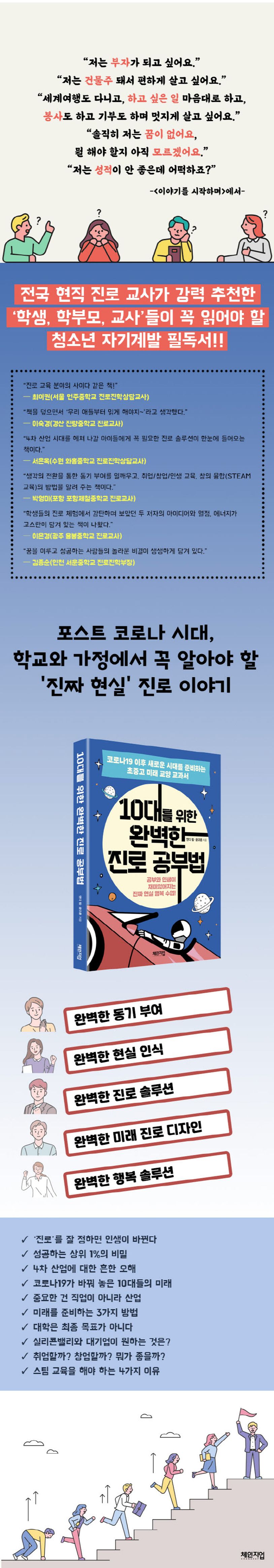 책을 읽는 청소년들은 ‘내가 반드시 잘될 수밖에 없는 5가지 이유’를 읽으며 동기부여가 되고, ‘어른들이 대학에 가라 하는 이유’ ‘공부를 못해도 성공하는 방법’ ‘취업에 성공한 선배들의 4가지 비결’ ‘스마트한 진로 설계를 위한 핵심 솔루션 4가지’ ‘코로나19가 바꿔 놓은 미래’ ‘미래를 준비하는 3가지 방법’ 등 다양한 현실 이야기와 솔루션 이해를 통해 자신의 진로에 대한 자신감을 갖게 될 것이다.
