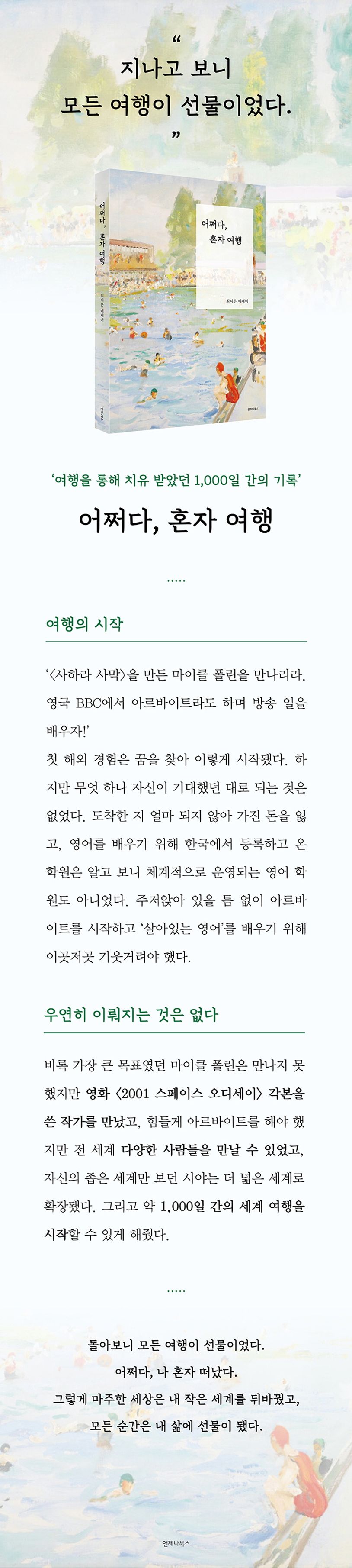 여행에서얻은것들:우연히이뤄지는것은없다‘〈사하라사막〉을만든마이클폴린을만나리라.영국BBC에서아르바이트라도하며방송일을배우자!’저자의첫해외경험은‘꿈을찾아’이렇게시작됐다.하지만무엇하나자신이기대했던대로되는것은없었다.도착한지얼마되지않아가진돈을잃고,영어를배우기위해한국에서등록하고온학원은알고보니체계적으로운영되는영어학원도아니었다.주저앉아있을틈없이아르바이트를시작하고‘살아있는영어’를배우기위해이곳저곳기웃거려야했다.자신의계획과는달랐지만,그렇게틀어진계획은결과적으로저자가자신만의길을갈수있게해줬다.비록가장큰목표였던마이클폴린은만나지못했지만영화〈2001스페이스오디세이〉각본을쓴작가를만났고,힘들게아르바이트를해야했지만전세계다양한사람들을만날수있었고,자신의좁은세계만보던시야는더넓은세계로확장됐다.그리고약1,000일간의여행을시작할수있게해줬다.그렇게그저이뤄지는인연과우연은없다는저자의삶의지론이이여행들을통해완성됐다.이책이단순한여행에세이가아닌이유다.이책속에는한사람이지나온20여년의시간이담겨있고,한사람의가치와삶의방향이만들어지는과정이담겨있기때문이다.어쩌다,혼자여행:혼자여서행복한여행,그리고함께여서든든한그길흔히여행은중독이라고말한다.그중에서도혼자하는여행은여행의중독범위에서도최상위라고할수있다.동행자를배려하느라눈치볼필요없고,원하는때에원하는곳으로마음대로움직일수있으며,낯선이와금방친구가돼함께목적지를향할수있기도하다.물론혼자인여행이늘좋다고할수는없다.여행은누군가와함께일때더편해지기도하고즐거움이배가되기도한다.저자또한훌쩍혼자배낭하나들쳐메고떠날수있던과거와달리이제는남편,아이와함께여행을떠난다.그리고함께하기때문에좋은것들을깨달아가고있다.한10년뒤쯤우리는’어쩌다,함께여행‘을쓰고있는저자의모습을만날수있을지도모르겠다.이책은저자가혼자여행했던지난과거의기록을담고있지만,’혼자떠나라‘라고말하는것이아니다.저자는자신의삶에멋진등대가돼준여행을다른사람들도누릴수있길바랐다.이책을통해누구라도여행을떠나고싶다는마음과용기를갖기를,여행을통해자신만의보석을발견하고자신이그랬던것처럼치유받을수있길바라며말이다.저자의이바람처럼누구나자유롭게자신만의빛나고찬란한보석을발견할수있는날이얼른다시오길바란다.