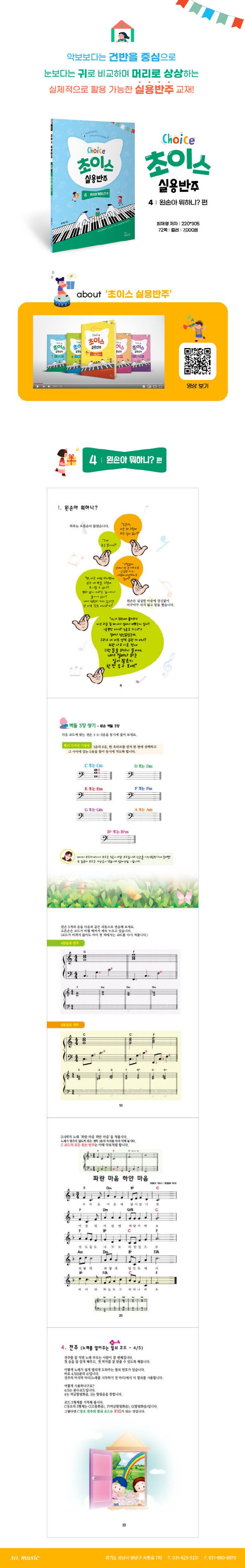 연습한 곡만 반주하는 것이 아니라 그와 비슷한 다른 곡들에도 적용할 수 있도록 하며, 현대적인 스타일과 화성에 익숙해지도록 지향합니다. 총5권으로 구성된 〈초이스 실용반주〉는 실제로 사용되지 않는 수준 높은 연주나 반주 패턴은 과감히 제하고 실질적으로 활용 가능한 내용을 담았습니다. 어렵게만 느껴지던 반주, 이제 반주의 고수가 되어보세요!