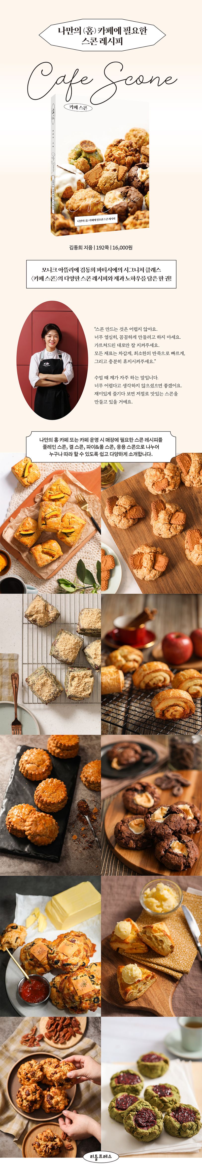 재료도 간단하고 도구도 많이 필요하지 않아 누구나 쉽게 도전할 수 있으며 실패할 확률이 적은 스콘. 나만의 홈 카페에, 또는 운영 중인 카페 매장에 필요한 스콘 레시피를 플레인 스콘, 결 스콘, 파이&롤 스콘, 응용 스콘으로 나누어 소개한다. 또 스콘에 곁들이면 좋을 스프레드와 잼 레시피도 놓치지 말아야 할 포인트이다.