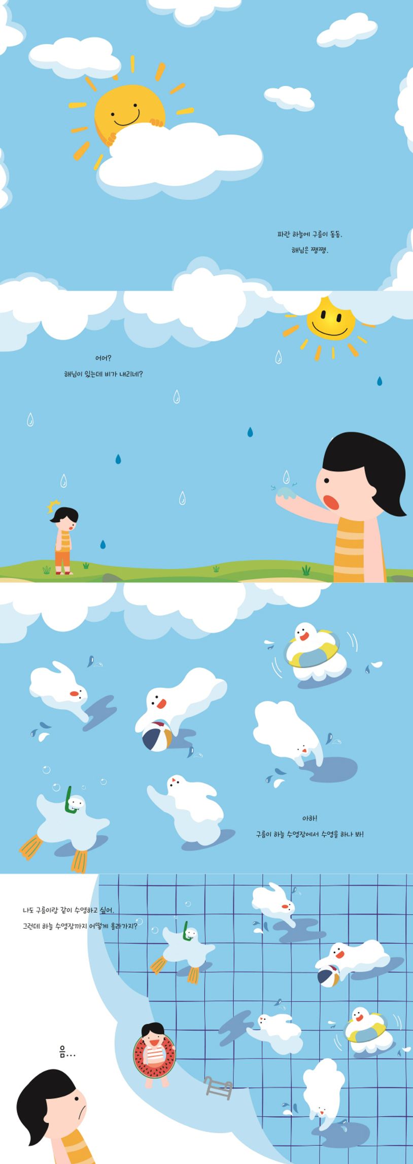 『하늘 수영장』의 이야기는 ‘왜 맑은 날에 비가 내리지?’라는 질문에서 시작됩니다. 맑은 날 갑자기 떨어지는 빗방울에 아이는 하늘을 올려다보고, 파란 하늘에 둥실둥실 떠있는 구름을 발견합니다. 그리고 그 하늘이 시원한 수영장처럼 느껴지자 아이는 구름이 하늘 수영장에서 물장구를 쳐서 비가 내리는 것이라는 상상을 합니다.