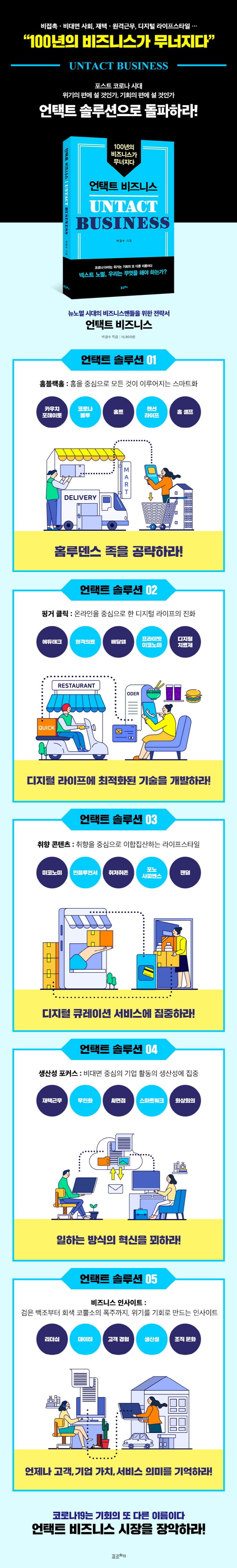 언택트는 사회적으로 거스를 수 없는 추세가 되었다. 비접촉, 비대면 사회는 예고된 미래였지만, 코로나19의 갑작스러운 등장으로 전환 속도는 매우 빨라졌다. 사람들의 라이프스타일은 크게 변화하기 시작했고, 100년의 비즈니스 궤도는 무너지고 있다. 《언택트 비즈니스》는 변화하는 사회에서 도태되지 않기 위해, 우리가 반드시 알아야 하는 비대면 트렌드를 손쉽게 파악할 수 있도록 안내한다. 트렌드 분석가이자 경영컨설턴트인 저자는 언택트와 관련된 국내외 수많은 자료를 분석하여, ‘홈 블랙홀’, ‘핑거 클릭’, ‘취향 콘텐츠’, ‘생산성 포커스’라는 변화의 키워드를 만들고, 각 키워드와 연결되는 뉴 비즈니스 모델을 소개한다. 나아가 현재 언택트 비즈니스 시장에서 무서운 속도로 성장하고 있는 기업들을 분석하며 한발 더 앞서 나아갈 수 있도록 날카로운 사업적 통찰력을 제시한다. 언택트 비즈니스 툴은 무서운 속도로 확장되고 있다. 뉴노멀을 지나 디지털 라이프 비즈니스의 사이클을 꿰뚫어보고 그 안에서 새로운 기회를 발견하고 싶다면, 당신은 분명 이 책을 통해 그 답을 얻을 수 있다.