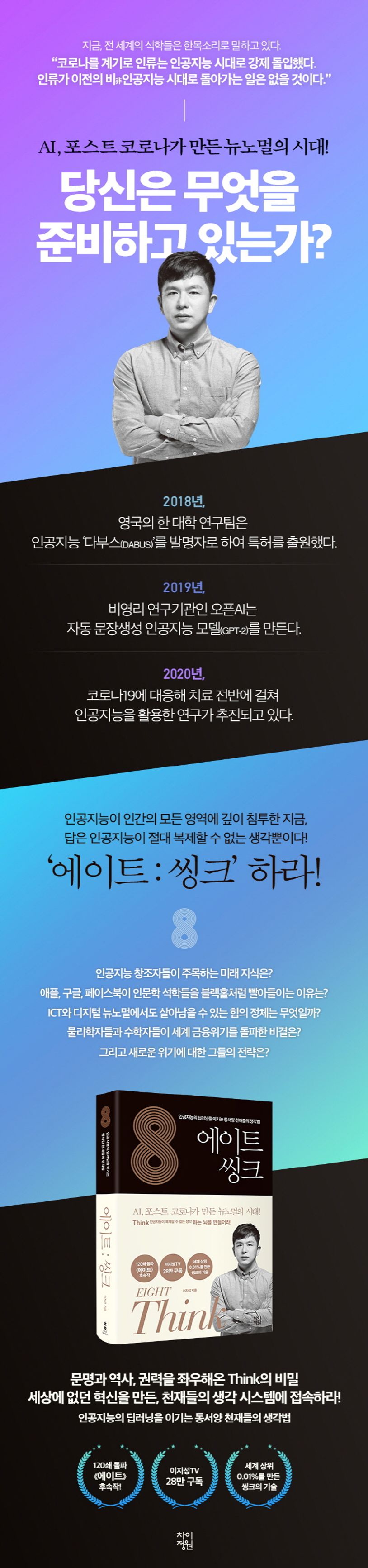 2019년신작《에이트》를통해,한국이마주할미래를예측했던저자이지성.2020년에그가‘에이트’를실천할수있는방법을답은《에이트:씽크》로돌아왔다.그간《에이트》를읽고,인간만이할수있는것이무엇인지물었던독자들에게그는좀더구체적으로‘인공지능의딥러닝을이기는Think’의힘을말한다.인공지능이복제할수없는생각을할수있어야만,인공지능의주인이될수있다는것이다.