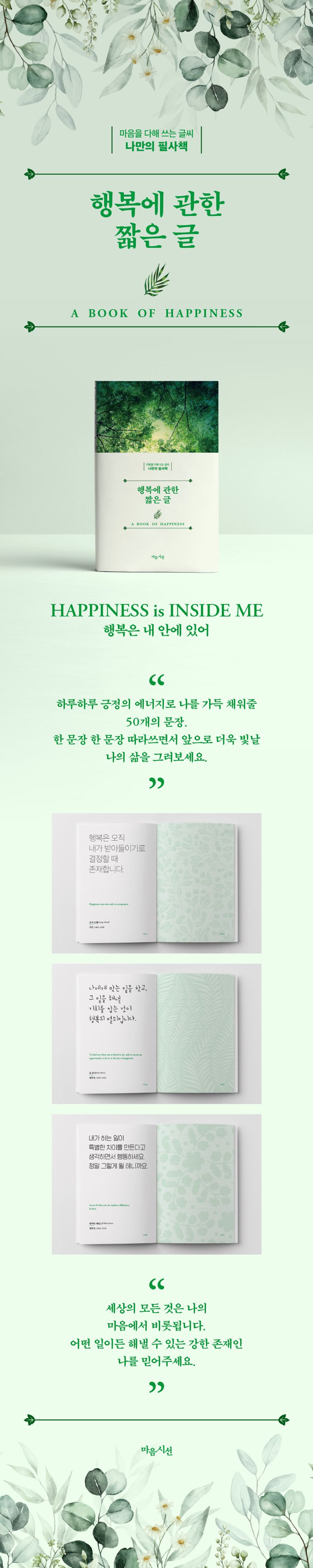 나만의 필사책 《행복에 관한 짧은 글》은 ‘행복은 나 자신의 마음먹기에 달려 있는 것이지, 어떤 결과로 인해 주어지는 것이 아니라는 것’을 깨닫고, ‘지금의 나’에게 가장 중요한 것이 무엇인지, ‘내가 생각하는’ 행복한 삶이 무엇인지 생각해보기 위해 만들었다. 평온함을 안겨주는 식물을 콘셉트로 표지와 본문을 디자인했고, 각 페이지별로 문장의 서체를 모두 달리해 보는 즐거움을 살렸다. 글씨를 썼을 때 뒷장에 비침이 적도록 두꺼운 본문 종이를 사용했고, 필사하기 편하도록 펼침성이 뛰어난 사철 노출 제본 형식을 택했다.