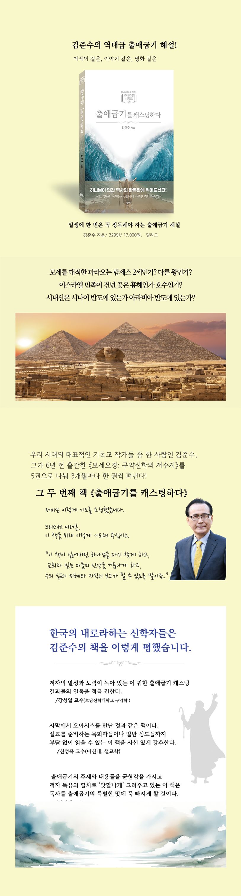 이 책은 작가이자 목사인 김준수가 야심차게 내놓는 ‘미래세대를 위한 모세오경 시리즈’ 두 번째 책이다. 저자는 출애굽기를 누구나 쉽게 읽을 수 읽도록 이 책을 썼다. 저자는 출애굽기의 핵심적인 쟁점들에 대한 국내외 유명 신학자들의 다양한 신학사상을 균형감 있게 다루면서 군데군데 자신의 견해를 밝혔다. 건강을 지키며 숨 쉬고 살아 있는 동안 김준수의 이 역대급 출애굽기 해설서를 한번 정독하시라! 서가에 꽂아놓고 읽고, 생각하고, 묵상한다면 날마다 단비 같은 은혜가 임할 것이다.