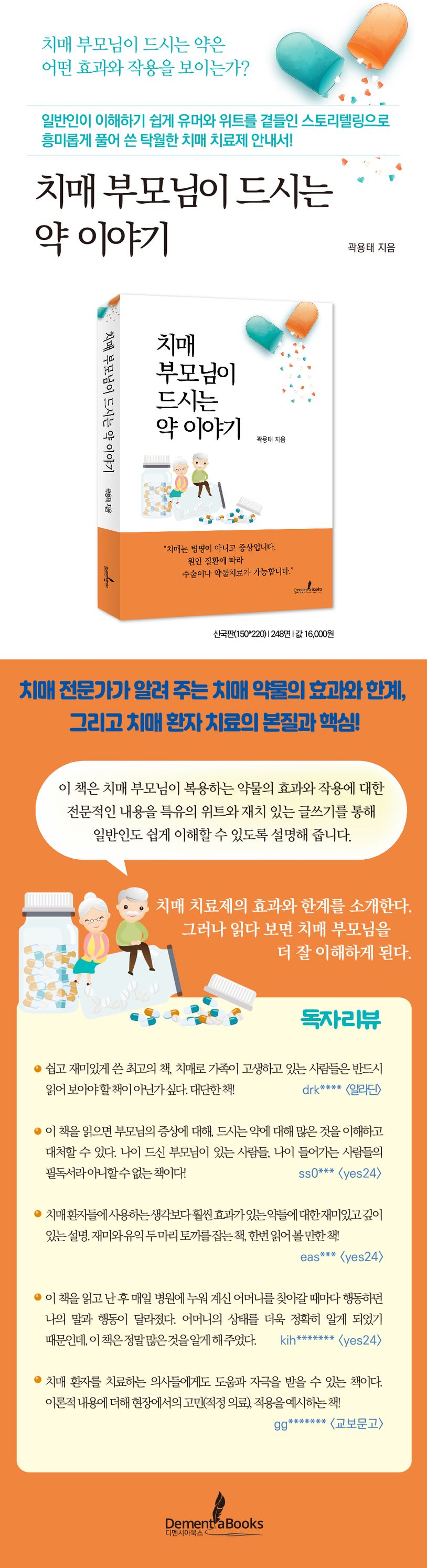 “치매 부모님이 드시는 약 이야기”는 저자가 치매전문 인터넷신문사인 ‘디멘시아뉴스’에 쓴 칼럼을 모아 출간한 “시련재판”의 개정증보판입니다. 이 책은 치매 부모님이 복용하는 약물의 효과와 작용에 대한 전문적인 내용을 특유의 위트와 재치 있는 글쓰기를 통해 일반인도 쉽게 이해할 수 있도록 설명해 줍니다. 많은 독자들의 호평과 사랑을 받아 온 초판 발간 이후 연재한 칼럼을 추가하고 일부 내용을 업데이트하여, 이번에 치매전문 출판사 디멘시아북스에서 완전히 새로운 디자인과 제목으로 선보이게 되었습니다.