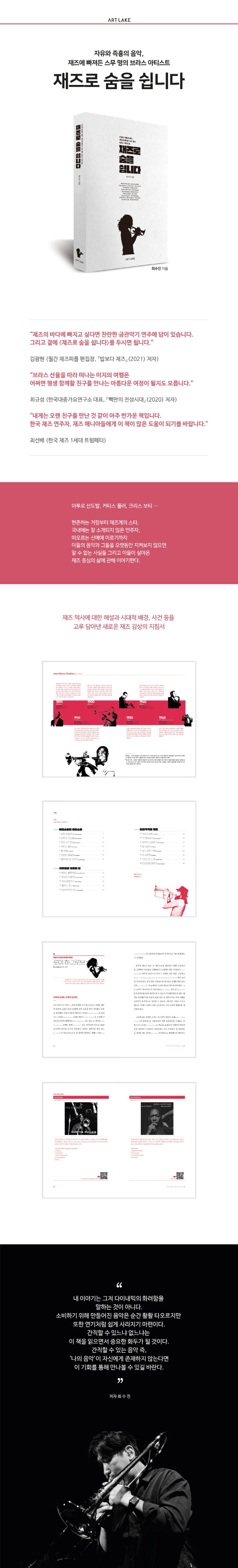 주로 재즈의 황금기를 이끌었던 거장들의 소개가 대부분인 타 서적과는 달리 다음 세대들을 조명하는 데 심혈을 기울였으며, 그들을 통해 재즈의 과거와 현재 그리고 미래를 〈재즈로 숨을 쉽니다〉 한 권에 모두 담아냈다. 이와 더불어 재즈 역사에 대한 해설과 시대적 배경, 사건 등을 고루 담아내며 새로운 재즈 감상의 지침서를 완성시켰다.