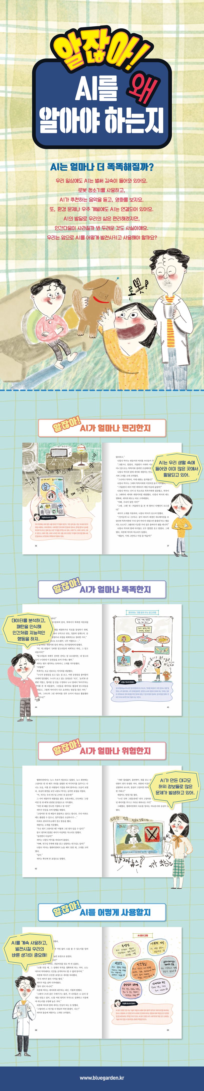 AI는얼마나더똑똑해질까?우리일상에도AI는벌써깊숙이들어와있어요.로봇청소기를사용하고,AI가추천하는음악을듣고,영화를보지요.또,나에게맞는음식점을추천받기도해요.환경문제나우주개발에도AI는연결되어있어요.AI의발달로우리의삶은편해졌지만,인간다움이사라질까봐두려운것도사실이에요.우리는앞으로AI를어떻게발전시키고사용해야할까요?AI,어느수준까지발전시키고사용을허용할것인가?노벨상은매년다양한분야에서인류의복지에공헌한사람이나단체에수여되는상이에요.그래서노벨상을받는다는건엄청난영광인셈이죠.그런노벨상이2024년에는유독인공지능(AI)에주목했다고해요.물리학상은물론화학상까지AI와관련된인물이수상한거예요.그만큼우리일상생활에AI가큰영향을미치고있다는뜻이기도해요.AI란사람의학습하는능력을모방해서,생각하고말하는능력등을컴퓨터프로그램으로실현한기술이에요.이를통해데이터를분석하고,패턴을인식해컴퓨터나로봇이인간처럼지능적인행동을하기도하지요.이런AI는우리생활속에이미깊숙이활용되고있어요.로봇청소기,챗봇,스마트폰음성서비스,인터넷포털사이트나SNS,OTT의추천서비스기능등은물론이고,어디서나흔히볼수있는키오스크나서빙로봇역시AI로운영된답니다.AI의활용은학습에도큰변화를만들었는데,대표적으로딥러닝(DeepLearning)이라고불리는‘기계학습(MachineLearning)’이에요.딥러닝은사람뇌의신경망을모방해만든‘인공신경망’을이용한것으로,데이터가많을수록더정확한결과를도출할수있지요.지난코로나19와같은세계적인팬데믹상황에서1년만에백신을개발할수있었던건,AI를이용해코로나19바이러스의구조를빨리파악할수있었기때문이에요.그래서많은제약회사들도AI를이용하거나개발하려하고있어요.하지만AI의발전이꼭인간의삶을좋게만들어주는지에대해서는논란이많아요.인공지능이발전할수록사람이하는일을기계가대신하게되면서,많은사람이일자리를잃어버릴수도있기때문이지요.문제는이뿐만이아니에요.쉽게구분하기어려운가짜이미지나동영상들로만들어진대규모허위정보들로인해심각한상황이만들어진다는거예요.이처럼우리들의삶에많은영향을미치는만큼AI를어느정도수준까지발전시키고사용을허용할지에대해서진지한논의가필요한시점이랍니다.《알잖아!AI를왜알아야하는지》는편리한AI에관한이야기로,일상생활속에서AI를만난쌍둥이의일상을통해,우리가어떻게AI를사용하고있는지,AI가우리에게어떤영향을끼치는지등을알아봅니다.또한,AI를계속사용하고,발전시킬인재가될우리친구들이AI에대해어떤관점을가져야하는지생각해보는좋은기회가될것입니다.*인증유형:공급자적합성확인