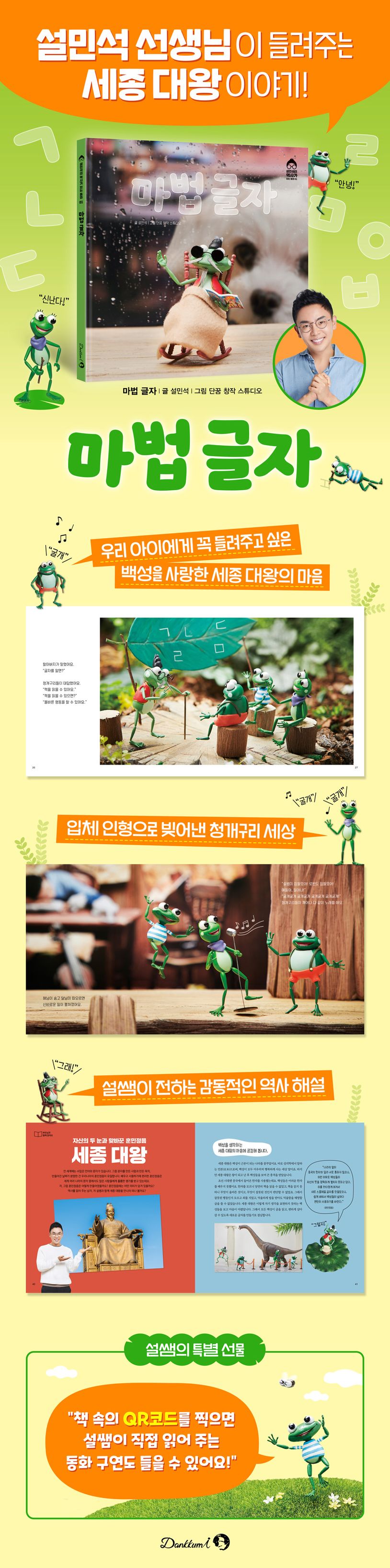 〈마법 글자〉는 설민석 선생님이 아이들에게 들려주고 싶은 역사 이야기를 담은 그림책입니다. 책 속에서 펼쳐지는 환상적인 이야기를 읽다 보면 우리 아이들은 자연스럽게 역사 속 한 장면을 마주하게 될 것입니다. 또한 재미있는 동화를 읽고 나서는 설민석 선생님이 전하는 감동적인 역사 해설까지 만날 수 있습니다.