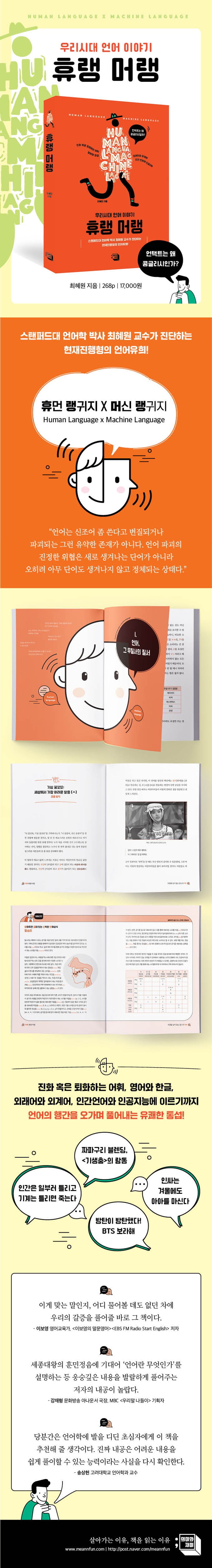 인간은 의사소통을 위해서만 언어를 사용하지 않는다. 언어 파괴를 넘어 언어 창조의 시대를 살아가는 현대인들에게 언어란, 정체성의 또 다른 표현이기도 하다. ‘머랭’ 하나에 의도적으로 세 가지 의미를 담는 것, 그래서 일부러 혼동을 유발하는 것, 즉 소통에 있어 질서와 정확성만을 추구하지 않는 것, 이런 면이 바로 인간 언어를 기계 언어와 구별 짓는 특징이라고 저자는 말한다. 따라서, ‘휴랭 머랭’은 저자가 이 책을 통해 답을 찾아보고자 하는 우리시대 언어에 대한 궁극적인 질문이기도 하다.