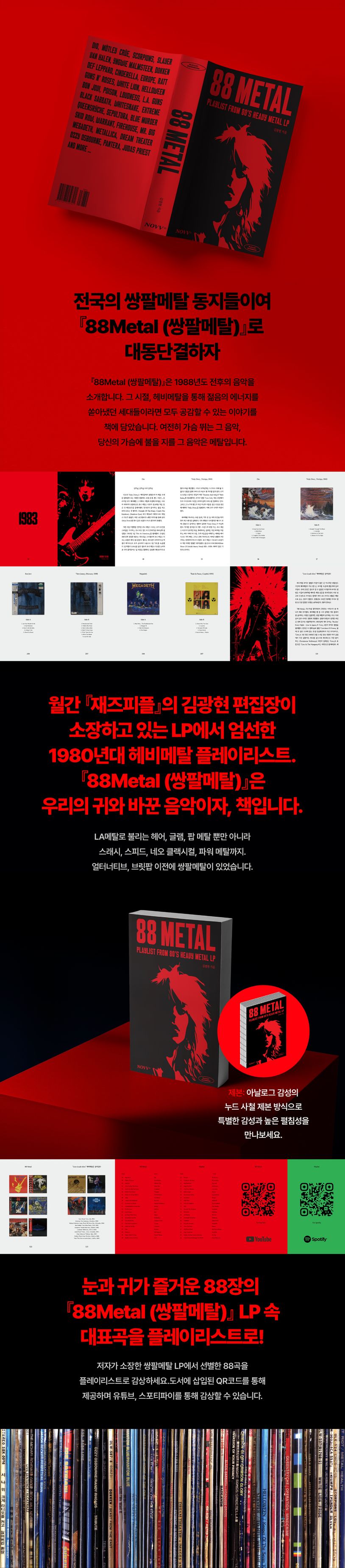 선정된 88장의 앨범은 모두 저자가 개인 소장하고 있는 LP에서 직접 골랐으며 커버 디자인에 사용된 일러스트와 사진의 사연뿐 아니라 전혀 다른 이미지를 달고 나온 국내 라이선스의 괴이한 모습을 보는 것도 재밌다. 도서에서 소개하는 88곡의 88Metal(쌍팔메탈) 플레이리스트는 QR코드 링크를 통해 유튜브, 스포티파이를 통해 감상할 수 있다.