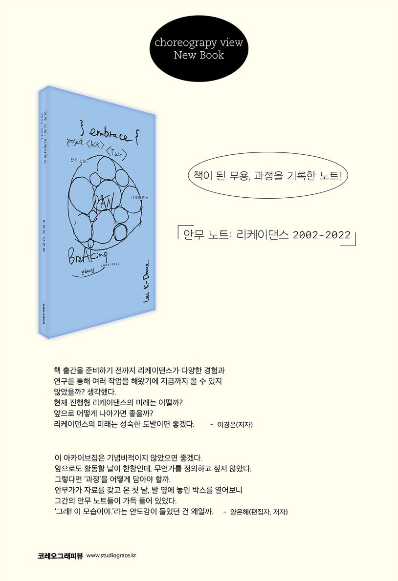 『안무 노트: 리케이댄스 2002-2022』는 현대무용단 리케이댄스의 20주년을 맞이한 아카이브집이다. 리케이댄스의 예술감독을 맡고 있는 이경은 안무가의 초기 안무 작품부터 무용단의 2022년까지 활동 중 대표적인 열 두 작품을 다루고 있다. 안무가가 안무를 구성하기 위해 20년 간 사용해온 몰스킨 노트는 일종의 안무책이었다. 무형의 움직임을 구성하기 위한 스케치이자 스코어의 기록들. 본 책은 안무가의 노트에 표기된 기호들에 대해 안무가와 편집자가 함께 나눈 대화이자 무대를 함께 만들어 온 동료의 시선 그리고 무용계에서 바라본 리케이댄스의 행보를 정리한 글이다. 20주년 아카이브집이되 기념비적이지 않고, 그간의 활동을 되돌아보고 앞으로 나아가기 위한 아카이브집인 것이다. 책 안에는 실제 안무노트의 내용들을 최대 반영하였다. 책의 여백과 글자 사이사이로 안무가의 글씨와 스코어, 드로잉들이 배치되어 있어 누군가의 안무 노트를 들춰보듯 가볍게 읽으며 독자는 자신만의 리듬과 움직임을 상상할 수 있을 것이다.