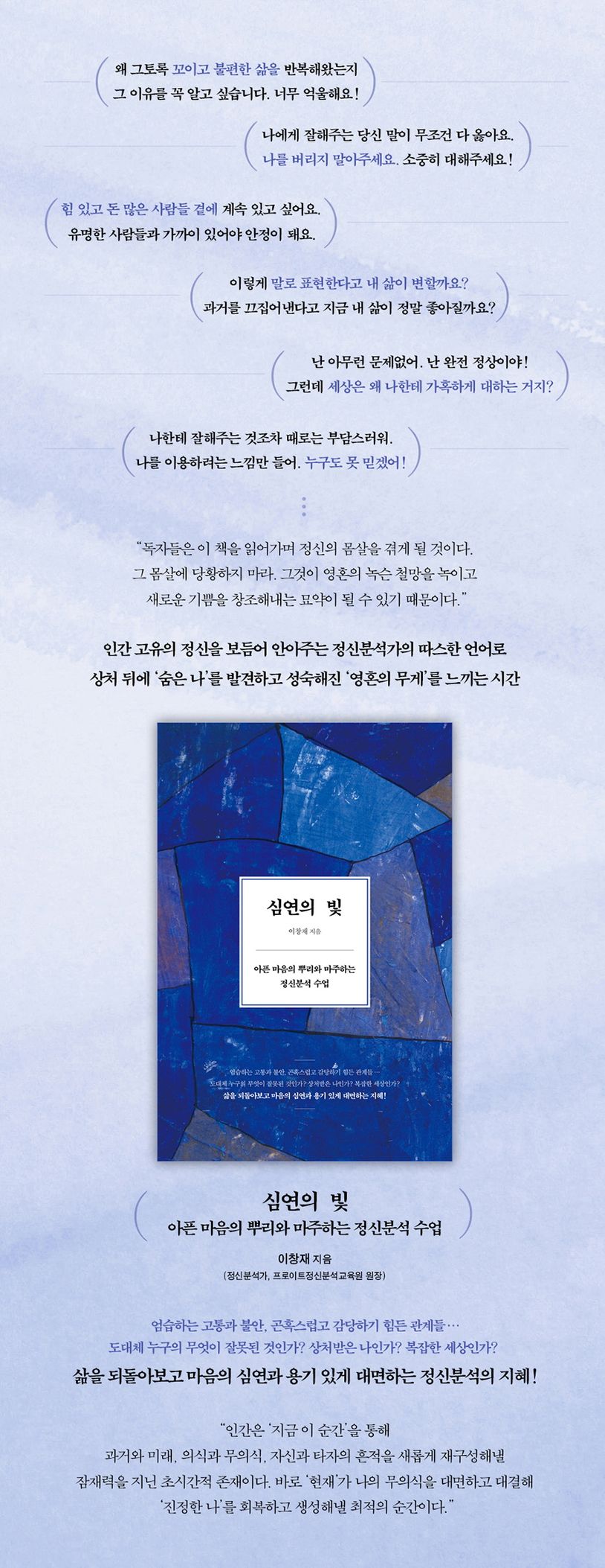 《프로이트와의 대화》, 《신화와 정신분석》 등 탁월한 저서로 한국 정신분석학의 지평을 넓혀온 정신분석가(프로이트정신분석교육원 원장) 이창재가 8년 만에 선보이는 정신분석 에세이. 지난 25년여간 인간 마음의 심연을 탐색하고 무의식의 상처를 끄집어내 따스한 공감의 언어로 어루만져준 정신분석가의 흔적들, 고통스런 마음과 용기 있게 대면하여 진정한 자기를 되찾은 사람들의 목소리가 생생히 녹아 있다.