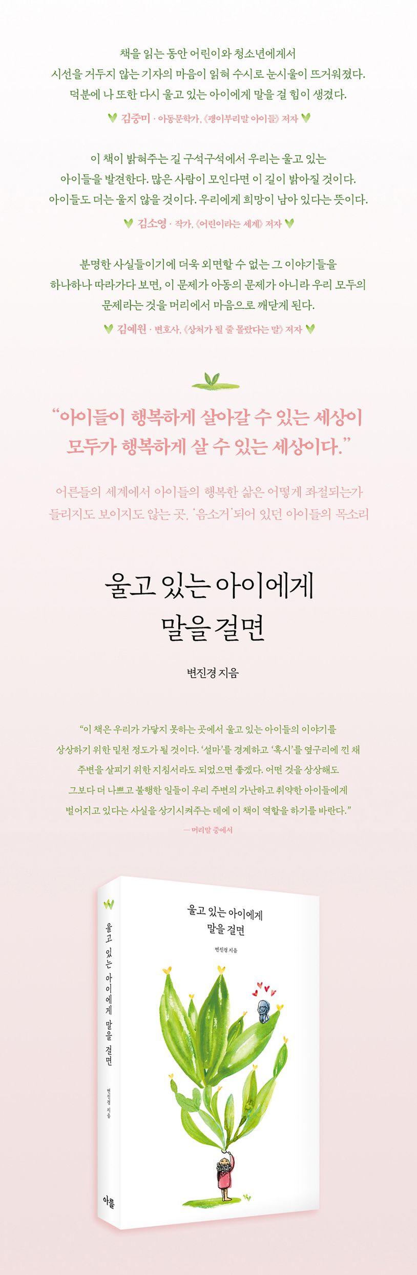 우리나라 아동 청소년들의 ‘생명’과 ‘삶’을 위협하는 다양한 문제들을 심층 취재하여 “표피로 드러난 사건과 숫자들” 아래에 감춰져 있던 아이들의 이야기를 담아낸 『울고 있는 아이에게 말을 걸면』. 어른들만을 위한 법이 제정되고, 어른들만을 위한 도시 계획이 수립되며, 아이들의 ‘미래 삶’이 아닌 어른들의 ‘당장 이익’을 위해 투표하는 세계에서 아이들의 목소리는 오랫동안 ‘음소거’되어 있었다. 수년간의 취재를 통해 저자가 본 한국 사회는 “아이들에게 유독 가혹한 세계”였다.