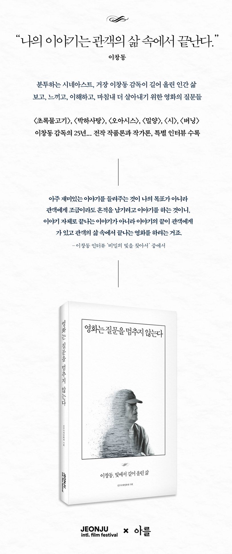 『영화는 질문을 멈추지 않는다』는 2022년 제23회 전주국제영화제에서 마련한 “이창동: 보이지 않는 것의 진실” 섹션(이창동 특별전)과 관련해 특별 기획된 책으로, 첫 번째 연출작 〈초록물고기〉(1997) 이후 끊임없이 인간 본성과 삶의 진실을 탐구해온 ‘거장’ 이창동 감독의 25년 작품 세계 전반을 되돌아본다. 파리시네마테크 프랑세즈 수석 프로그래머 장 프랑수아 로제의 서문 ‘보이지 않는 것의 진실’을 필두로 국내외 영화평론가들이 참여한 전작 6편(〈초록물고기〉, 〈박하사탕〉, 〈오아시스〉, 〈밀양〉, 〈시〉, 〈버닝〉)의 작품론과 작가론, 영화평론가 김혜리와 이창동 감독의 최신 인터뷰가 수록되어 있다. 이 책은 영문판 “Lee Chang-dong: Films That Never Stop Asking Question”으로 동시 출간되었다.