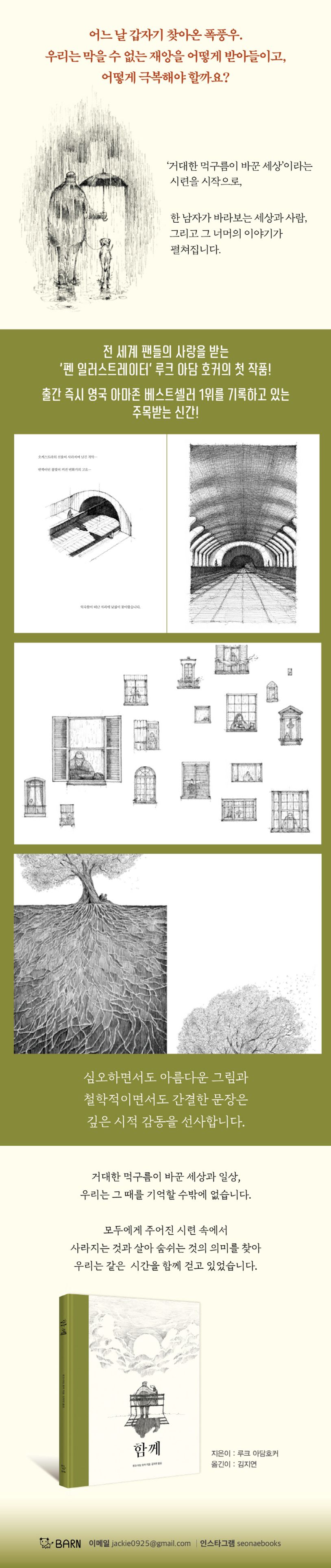 〈함께〉는 출간 전부터 몇 컷의 그림만으로도 화제를 불러온 경이로운 작품으로 평가받고 있습니다. 잉크 펜으로 그린 선은 강약과 기법, 자유로운 표현과 다양한 묘사로 감각적 분위기를 만들어 줍니다. 작가의 섬세한 그림과 울림이 있는 글을 통해 위안과 감동을, 또 희망을 가지기를 바랍니다.