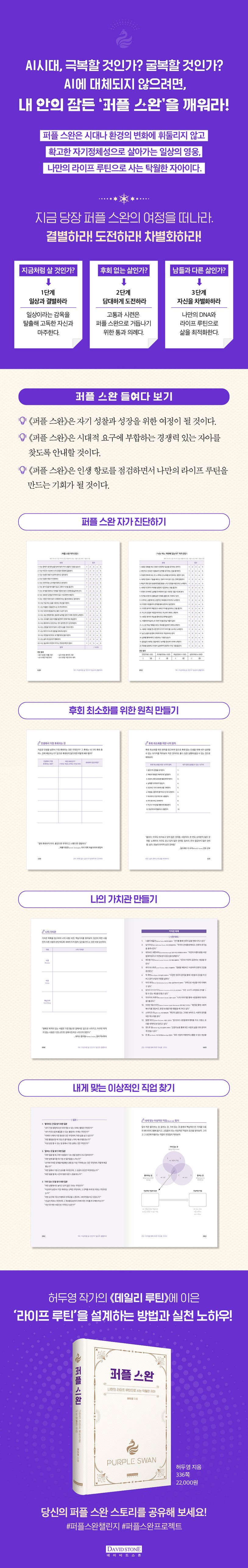 《퍼플 스완》은 이 시대의 화두에 대한 현명한 대안을 제시한다. 새로운 인공지능 시대의 변화에 휘둘리지 않고 자기 정체성을 확립하며, 나만의 라이프 루틴으로 탁월한 자아를 실현하는 방법, 바로 ‘퍼플 스완 프로젝트’이다. ‘퍼플 스완’은 저자가 새롭게 명명한 것으로, 시대나 환경의 변화에 흔들림 없이 확고한 정체성을 가지고 살아가는 우리 안의 숨겨진 영웅을 일컫는다.