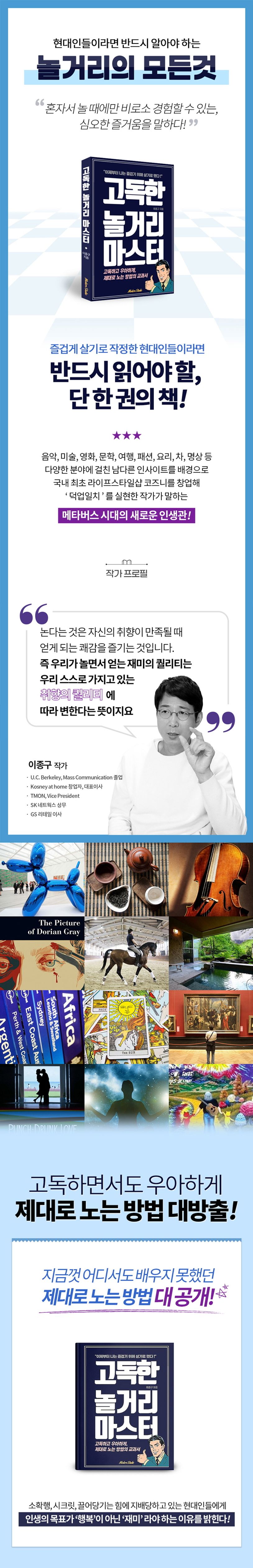 평소 음악, 미술, 문학, 영화, 패션, 여행 등 다양한 분야에서 쌓은 남다른 인사이트를 바탕으로 사회적으로도 큰 성공을 거둔 작가가 본인이 직접 경험한 놀거리들을 다룬 이 책은, 단순히 우리에게 놀거리들의 정보들을 제공하는 데에서 더 나아가 그것들을 어떤 태도와 방법으로 즐길 수 있는지 그 노하우를 알려준다.