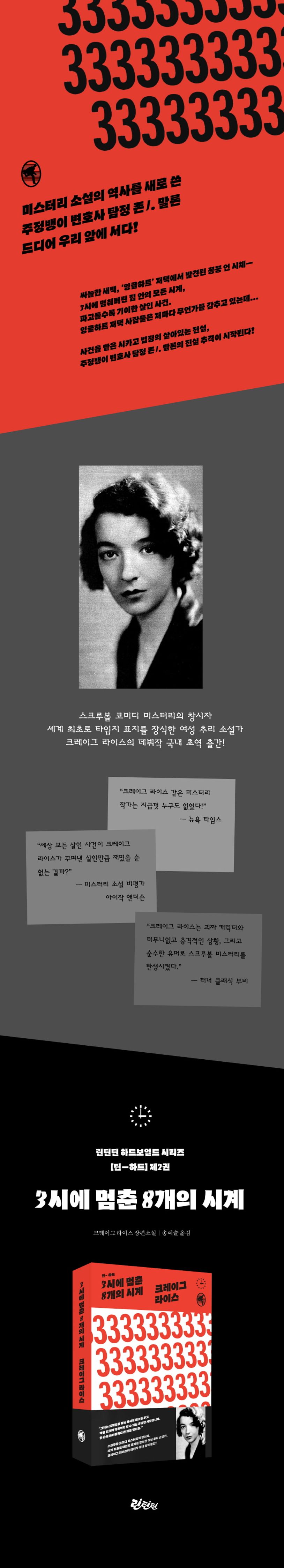“영국식의 고상한 후던잇과 미국식의 터프한 하드보일드를 모두 갖춘 유일무이한 미스터리 작가”라 불리며 추리소설계를 뒤집어 놓았던 크레이그 라이스. 그녀의 데뷔작 『3시에 멈춘 8개의 시계』 초역본이 마침내 국내에서 출간되었다.