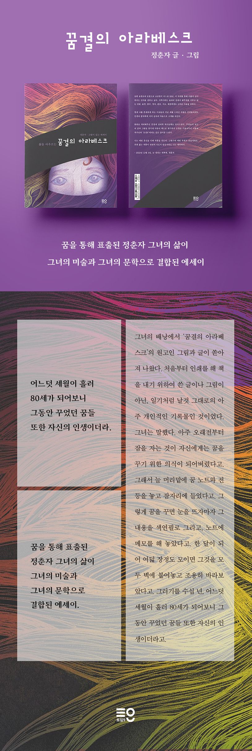 이 책은 조각가이자 화가인 정춘자 작가가 잠을 자며 꾼 꿈을 글과 그림으로 기록한 또 다른 형태의 새로운 작품집이다. 그녀의 삶이 꿈결로 어우러진 비망록인 것이다. 그랬기에 ‘꿈결의 아라베스크’라는 제목을 달게 되었다. 아라베스크란, 좁은 의미로는 이슬람 공예나 건축의 평면장식에 사용하는 아름다운 곡선과 부분적인 직선, 혹은 직각으로 된 좌우대칭 문양을 말한다. 그리고 넓은 의미로는 유동적인 선에 꽃이나 과실, 짐승, 인물 등을 섞은 문양을 뜻한다. 정춘자, 그녀의 꿈결에 새겨진 희로애락의 문양은 곧 그녀의 삶이며, 그녀의 삶은 곧 꿈결의 아라베스크인 것이다. - 장자의 호접몽을 떠올리며, 이평재 소설가