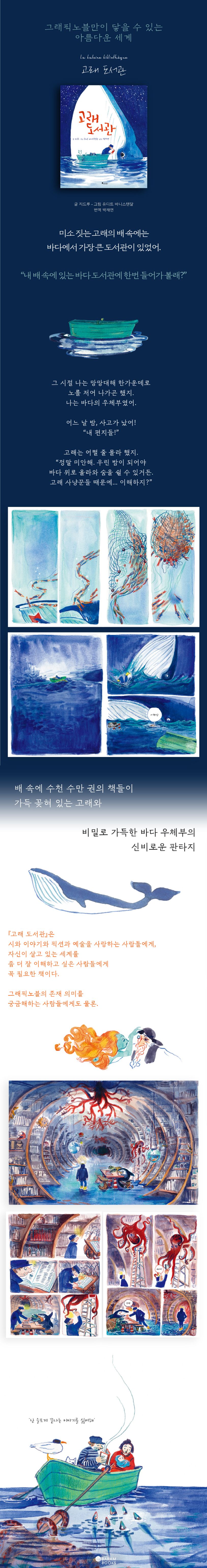 『고래도서관』의 이야기는 신화나 전설을 닮았고, 문장은 시처럼 은유와 상징으로 가득하고, 유디트 바니스텐달의 신비로운 그림이 글자와 글자 사이의 여백을 파도처럼 드나들며 철썩인다. 그래픽노블이 아니라면 표현할 수 없는 세계가 여기 있다. 작고 반짝이고 알록달록한 생명들로 가득한 바닷속, 고래 배 속에서 나온 우체부가 맞는 희부연한 아침, 고래가 마침내 인간들에게 죽임을 당할 때 바다를 붉게 물들이는 고래의 심장, 고래 도서관에서 쏟아져나온 책들이 당도한 바닷가에서 이야기에 몰입한 사람들의 어깨 위로 내리는 별빛들. 우체부가 가져다준 낙엽에서 사랑과 죽음과 슬픔을 읽어낼 줄 알던 고래는 낙엽을 수집하고 싶어 했지만 무방비하게 우체부를 기다리다가 죽음을 맞았다. 아이가 태어나는 통에 약속을 지키지 못했던 우체부는 고래사냥꾼 대신 죄책감과 슬픔을 느낀다. 언제나 그렇듯 자연을 망치는 인간과 잘못을 통감하는 인간은 일치하지 않는 법이다. 하지만 슬픈 이야기를 싫어하는 고래를 위해 우리는 언제까지고 파도에 밀려온 책을 읽어야 할 것이다. “더 이상 소금 맛이 나는 눈물이 흐르지 않도록.”