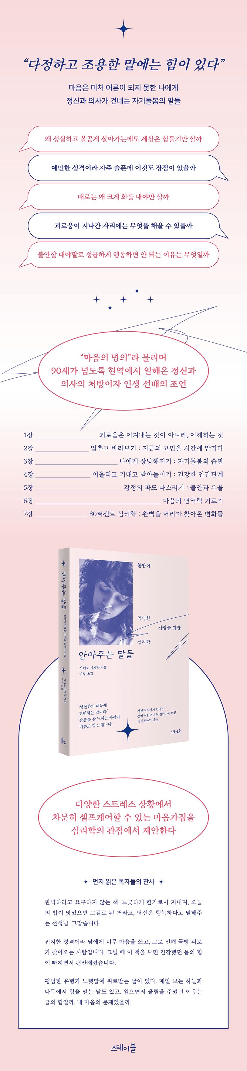 《안아주는 말들》은 “마음의 명의”라는 별명을 가진 정신과 의사가 쓴 ‘불안이 익숙한 사람을 위한 심리학’ 책이다. 현대인이 가진 불안과 우울 등을 오랜 시간 진료와 집필을 통해 연구해온 저자가 특유의 통찰력과 부드러운 발상, 인간미 넘치는 말투로 써내려갔다. 독자가 다양한 스트레스 상황에서 차분히 셀프케어할 수 있는 마음가짐을 심리학의 관점에서 제안한다. 이는 정신과 의사로서의 처방이자, 90세가 넘도록 현역에서 일했던 인생 선배로서의 조언이기도 하다. 마치 가까운 사람에게 개인적으로 쓴 편지인 듯 따뜻하고 상냥한 문장이 특징이다.