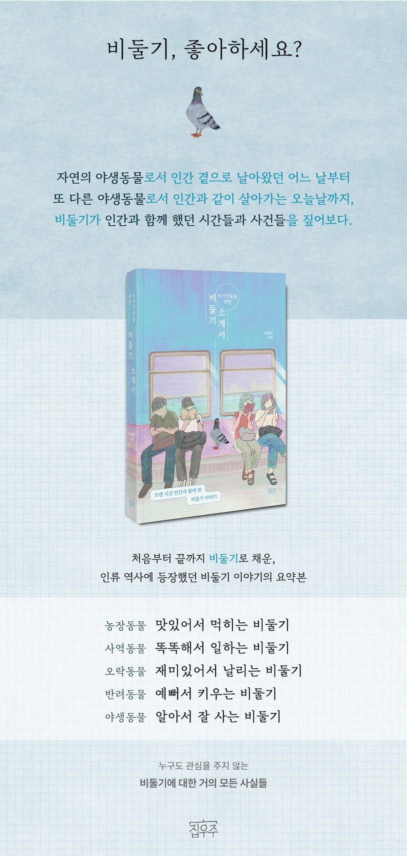 〈도시인들을 위한 비둘기 소개서〉는 비둘기를 소개하는 책이지만 비둘기를 향한 사랑부터 사라지길 바라는 미움까지, 자연스레 비둘기를 대하는 ‘인간의 마음’도 들여다본다. 작가의 바람처럼 이 책을 읽고 도시의 ‘닭둘기’가 달리 보인다면, 그 따뜻해진 눈을 다른 동물들에게도 옮길 수 있게 될 것이다.