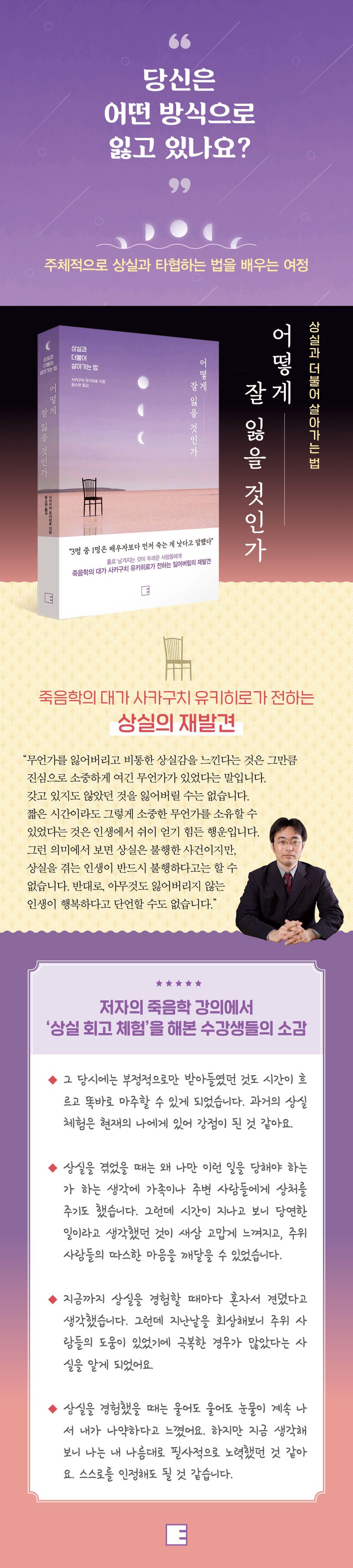 이 책은 우리가 지닌 상실에 대한 고정관념을 깨면서 저마다 ‘잘 잃어버리는 나만의 방식’을 찾아가도록 돕습니다. 살면서 만날 수 있는 상실의 장면들을 살피며 각각의 상실이 우리 삶에 미치는 영향을 다방면으로 확인할 수 있습니다. 혹시 무언가를 잃고 슬픔, 죄책감, 공허함 등으로 고통받고 있다면 이 책이 상실과 마주하고 타협하는 거울이 되어줄 것입니다.