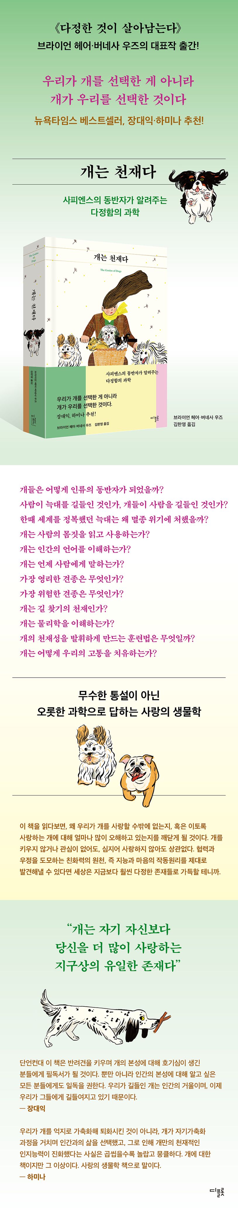 개는우리의오랜친구다.인류가개를선택한것인가,개가인류를선택한것일까?인지과학으로진화인류학의새로운길을개척해낸브라이언헤어와함께이질문을좇다보면,우리는지금껏세상을유유히지배해왔던통념을거스르고마침내경이에찬눈으로그들을바라보게된다.‘너희는천재였어!’