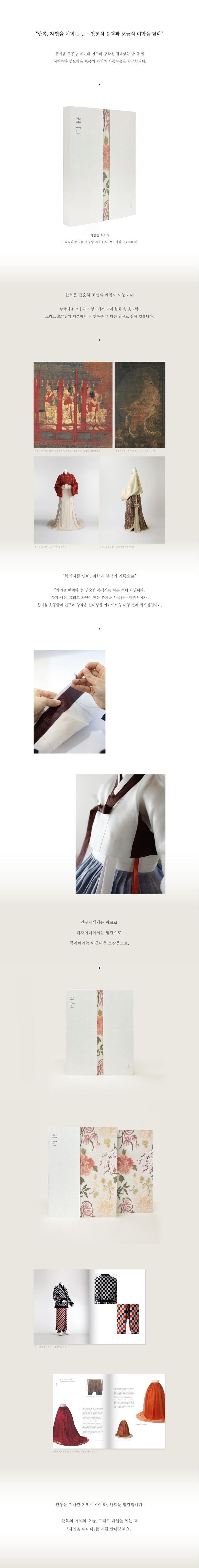 오늘, 전세계적으로 관심이 높은 한복은 자연을 여민 옷입니다. 사람과 옷 사이 작은 공간에 광활한 자연이 있고, 또 많은 이야기를 내포하고 있습니다. 착용자의 매무새와 그가 시시각각 만들어내는 움직임에 따라 때로는 완전히 새로운 느낌을 만들어내기도 하는 유동성은 한복이 품은 독특한 매력입니다. 예술적으로도 무한한 가능성이 엿보이는 특징이기도 하지요.