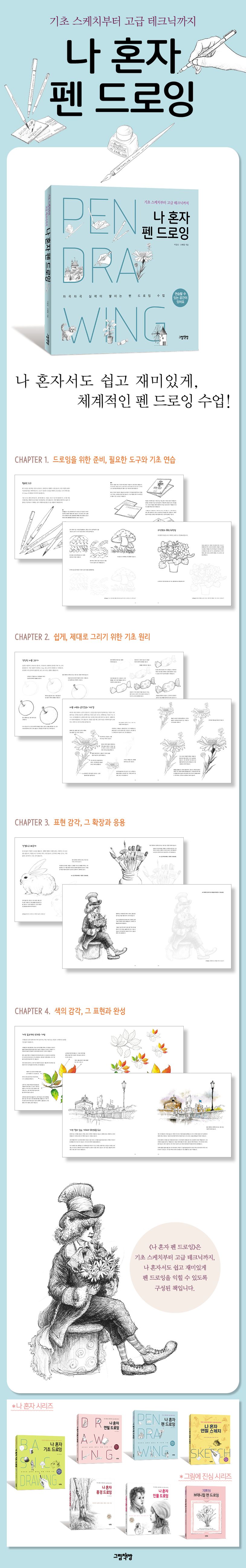 CHAPTER1.드로잉을위한준비,필요한도구와기초연습필요한도구드로잉에적합한펜유성잉크와수성잉크의표현차이라인펜의특성과선표현라인펜의표현워밍업딥펜의특성과선표현딥펜의표현워밍업붓펜의특성과선표현붓펜의표현워밍업볼펜의특성과선표현볼펜의표현워밍업그밖의펜유형과표현CHAPTER2.쉽게,제대로그리기위한기초원리간단한사물그리기구체적인드로잉계획과진행과정선의굵기와라인드로잉사물의구조와형태면의흐름과선방향사물의색과펜의톤입체감,빛방향과면의단순화숨은구조이해하기대략적인밑그림과펜선사물의특성과질감표현세로선과공간표현사물내부의공간감과거리감서로다른개체의조화와강약조절CHAPTER3.표현감각,그확장과응용인물표현과부분생략일부분만강조선을끊지않고빠르게형태의변형과조화건물형태의자연스러운변형과장과표현의극대화펜으로대략적인밑그림을밑그림없이그리기간결하고빠르게붓펜의갈필효과같은소재다른표현러프스케치와상상속이미지역사적인물과풍경역사적상황을인물중심으로사람이많은장면이미지와상황강조라인펜,딥펜,붓펜을함께뜻하지않은장소나조건에서CHAPTER4.색의감각,그표현과완성색칠에적합한도구가장효과적인수채화기법사물의구조와색칠질감의표현정도와색칠비중이비슷한색들의조화인물의성격에맞춰구도와크기의대비복잡한구조물과색칠하나의색만필요한경우개체가많은광장의풍경가장멀리있는개체에포인트를두고큰덩어리로소재를나누어서다른재료도함께써서