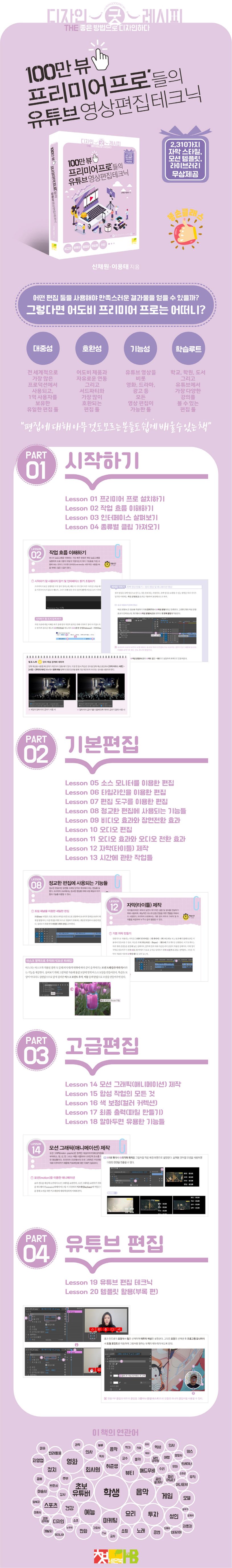 실무형 예제를 통한 학습과 독자들에게 특별히 제공하는 2,310가지 자막 스타일, 모션 템플릿, 라이브러리를 제공하여 고퀄리티의 결과물을 얻을 수 있다.