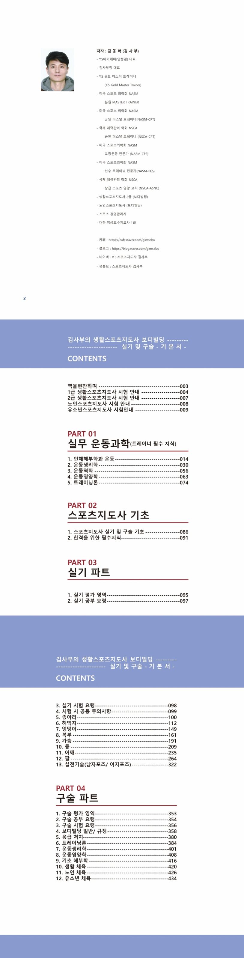 - 본 교재는 ‘김사부의 2급생활 스포츠지도사 실기 및 구술 최사위 수험서’의 후속편으로 저자의 지난 10년간의 교육 노하우와 수 십년간의 트레이닝 노하우를 모두 담은 최고의 수험서이다. 저자는 시험 합격을 위해 필요한 모든 노하우와 지식들을 빠짐없이 담기위해 노력했으며, 트레이너 실무에 꼭 필요한 필수 지식들 역시 포함하고 있다. 트레이너들과 예비 트레이너들의 스포츠지도사 시험 합격을 위해 꼭 필요한 수험서이며, 자격증 취득 후 실무 트레이닝 시 꼭 필요한 실무 지식들을 포함하고 있기 때문에 빠른 실무 적응과 트레이닝 능력 향상을 얻을 수 있을 것이다. 기본서로 만들어지다 보니 수험생들은 책의 내용이 많다고 느낄 수 있겠지만, 지나고 나면 이 책의 내용들이 수험생들의 지식을 얼마나 많이 성장시켰는지 느낄 수 있을 것이며, 이것은 트레이닝 실무에서의 성공으로 연결될 수 있을 것이다. 저자는 네이버 카페 ‘스포츠지도사 Y.S아카데미’를 통해 실기 및 구술 인강을 공개하고 있으며, 교재 등록 후 교육생 등급이 되면 모두 무료로 수강이 가능하다.