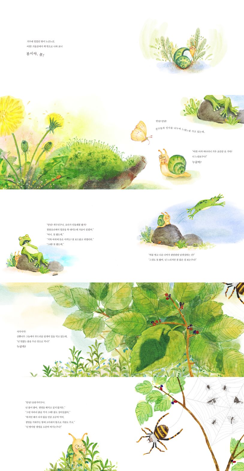 《나는 달팽이》의 주인공 달팽이는 겨울잠에서 깨어나 여행을 떠납니다. 그 과정에서 개구리와 호랑거미, 박각시나방과 왕개미, 고추잠자리와 지렁이를 만납니다. 이들은 달팽이의 생김새와 행동 등을 자신과 비교하며 비웃거나 조롱합니다. 하지만 달팽이는 자신을 놀리는 그들에게 화를 내지도 않고, 자신을 전혀 부끄러워하지도 않습니다. 오히려 그들에게 “나는 너희들과 달라. 그렇지만 내가 틀린 것은 아니야!” 하고 당당하게 말합니다.