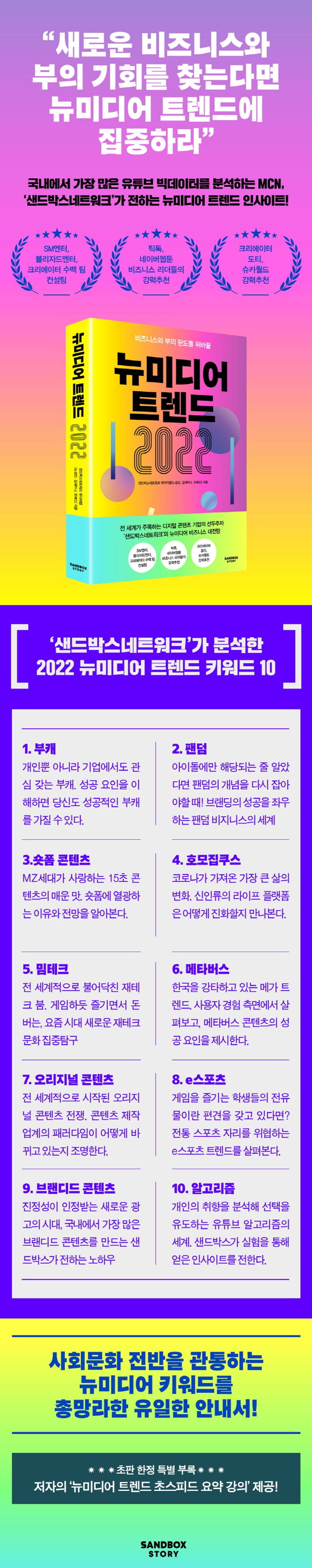 국내에서 가장 많은 유튜브 빅데이터를 분석하는 MCN 샌드박스네트워크는 이 책에서 사회 변화의 맥락을 짚어내고, 앞으로 전개될 사회문화 트렌드의 변화를 거시적으로 예측한다. 그리고 이를 좀 더 깊이 있게 다루기 위해 10개의 트렌드 키워드 ‘부캐, 팬덤, 숏폼, 호모집쿠스, 밈테크, 메타버스, 오리지널 콘텐츠, e스포츠, 브랜디드 콘텐츠, 알고리즘’을 선정해 분석한다. 이 책을 통해 뉴미디어 산업의 최신 동향부터 시장 전망까지 파악하며, 새로운 비즈니스와 부의 기회를 발견할 수 있을 것이다.