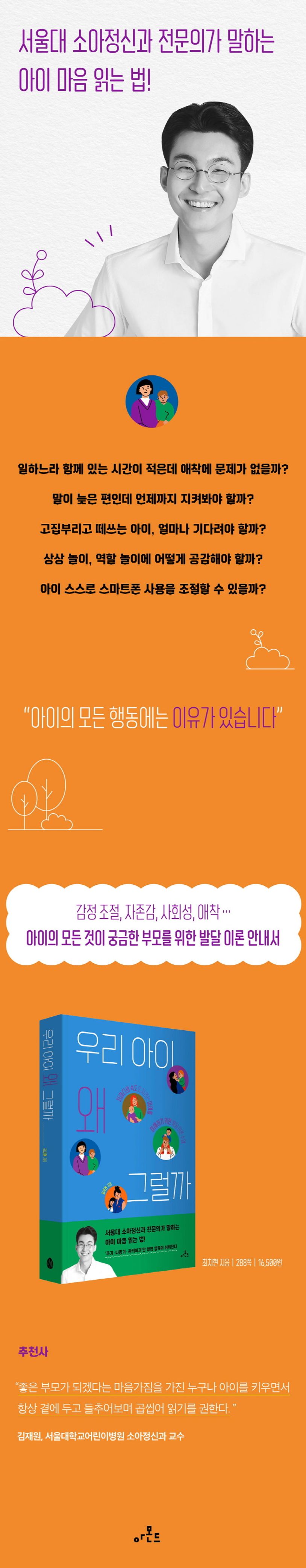일하느라함께있는시간이적은데애착에문제는없을까?말이늦은편인데언제까지지켜봐야할까?고집부리고떼쓰는아이,얼마나기다려야할까?아이스스로스마트폰사용을조절할수있을까?어린이집에만가려고하면울고불고하는데계속보내야할까?아이에관해궁금하고걱정스러운것이있을때부모들은답답한마음에인터넷을검색하고유튜브동영상을찾아보며지금당장써먹을수있는해법을찾아내려애쓴다.하지만육아선배들의경험에서우러난조언이나“이렇게하면됩니다!”라고말하는전문가들의족집게해법이우리아이에는딱맞지않아답답함을느낀다.왜우리아이에게딱맞는정답은없을까?