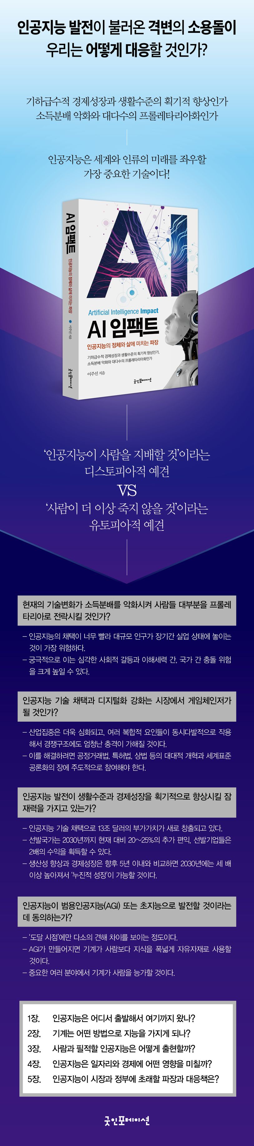 인공지능의 정체는 무엇이며 우리 삶에 미치는 파장은 어느 정도일까? 기하급수적 경제성장과 생활수준의 획기적 향상을 가져다줄까, 아니면 소득분배 악화와 대다수 사람들을 프롤레타리아화 하게 될까? 현재 기업&경제연구소장과 연세대학교 경영대학원 겸임교수로 있는 이주선(前 SKT 고문)박사가 인공지능 발달의 역사, 기술 및 장래에 대한 연구와 분석, 그리고 시장과 사회에 초래할 파장과 대응책들에 대한 논의들을 총망라한 [AI 임팩트]를 출간했다.