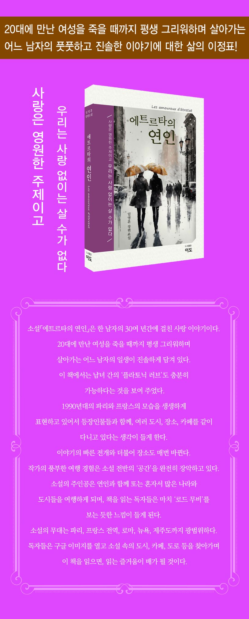 소설 ‘에트르타의 연인’은 한 남자의 30여 년간에 걸친 사랑 이야기이다. 20대에 만난 여성을 죽을 때까지 평생 그리워하며 살아가는 어느 남자의 일생이 진솔하게 담겨 있다. 이 책에서는 남녀 간의 ‘플라토닉 러브’도 충분히 가능하다는 것을 보여 주었다.
