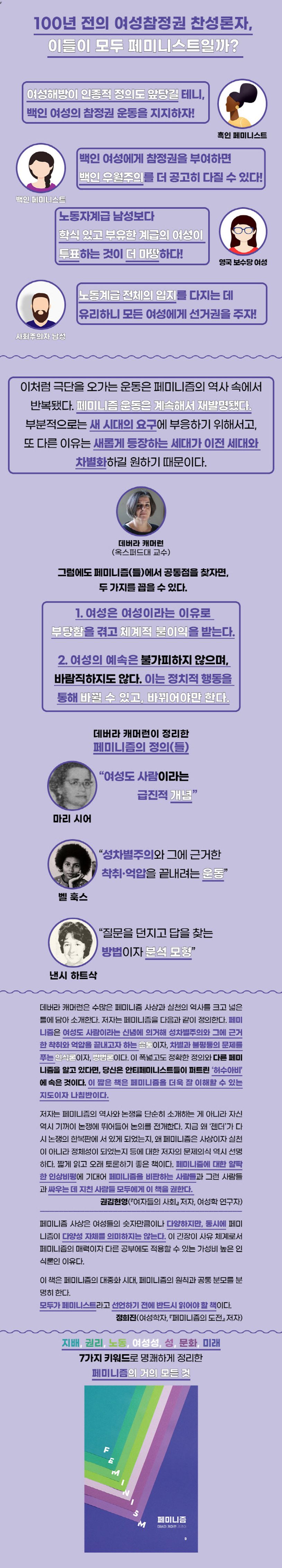 페미니즘은 하나의 명확한 이야기로 정리할 수 없다. 몇몇 사건으로도 요약할 수 없고, 사상가 몇 명의 말로도 정의할 수 없으며, 정치 조직과 운동으로도 설명할 수 없다. 그 모든 것이 모여 페미니즘을 구성한다. 페미니즘의 다양한 주제 중에서 지배.권리.일.여성성.성.문화.미래라는 7가지 키워드로 페미니즘의 거의 모든 것을 포괄해 설명하는 입문서.
