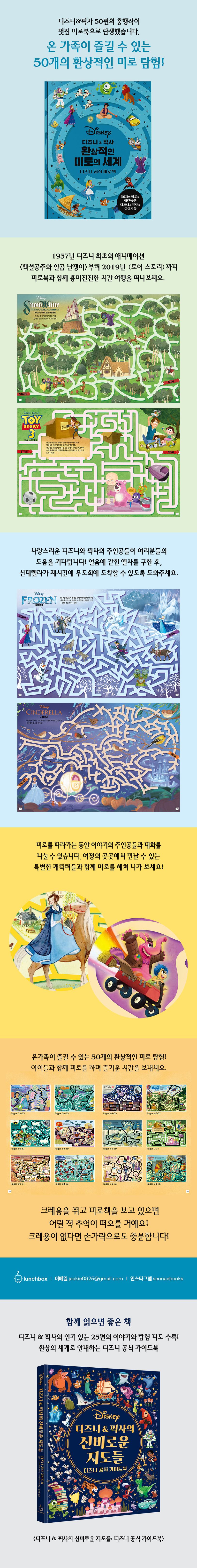 50개의 디즈니 & 픽사의 흥행작을 토대로 멋진 미로북이 완성되었습니다. 1937년 디즈니 최초의 애니메이션 영화로 발표된 〈백설공주와 일곱 난쟁이〉부터 2019년 〈토이 스토리〉까지 미로북과 함께 흥미진진한 시간 여행을 떠나보세요. 미로를 따라가며 길을 찾는 동안 이야기의 주인공들과 대화를 나눌 수 있습니다. 여정의 곳곳에서 만날 수 있는 특별한 캐릭터들이 책으로부터 눈을 뗄 수 없게 만들어주니까요. 철저하게 계산된 미로의 시작과 끝을 연결하는 각각의 이야기가 전하는 즐거움까지 만끽할 수 있습니다.