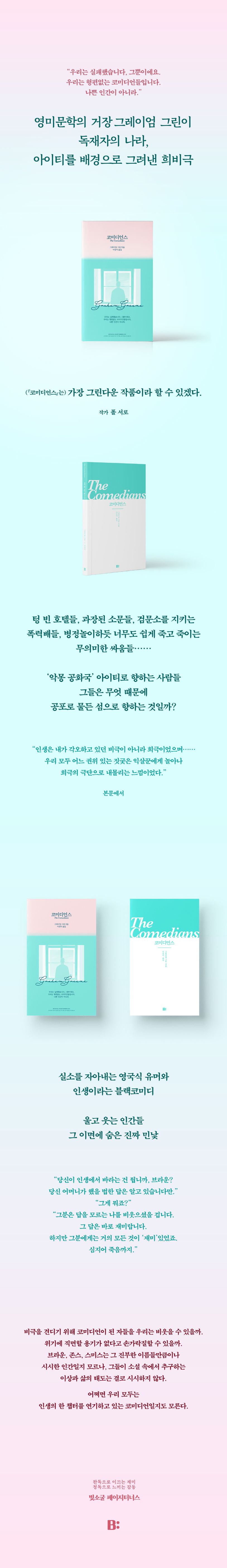 “『코미디언스』는불안정의소설이다.아이티에도,아이티인들에게도희망은없다.먹을것도없다.정부는기생충처럼국민을괴롭힌다.제대로돌아가는것은아무것도없다.이제어찌해야할까?흠,섹스(그건가능하다).신앙(부두교는나름의흥취를갖고있으며,가톨릭교의하느님은천국에서구원을약속한다).사랑(이곳에사랑은별로없다).코미디(이건꽤많다.사실,꼭필요하다).비극은희극에꽤가깝다고,그린은쓴바있다.다른모든것이실패로돌아갈때?이소설에서도다른모든것이실패로돌아간다?웃음만은항상존재한다.”_해설에서