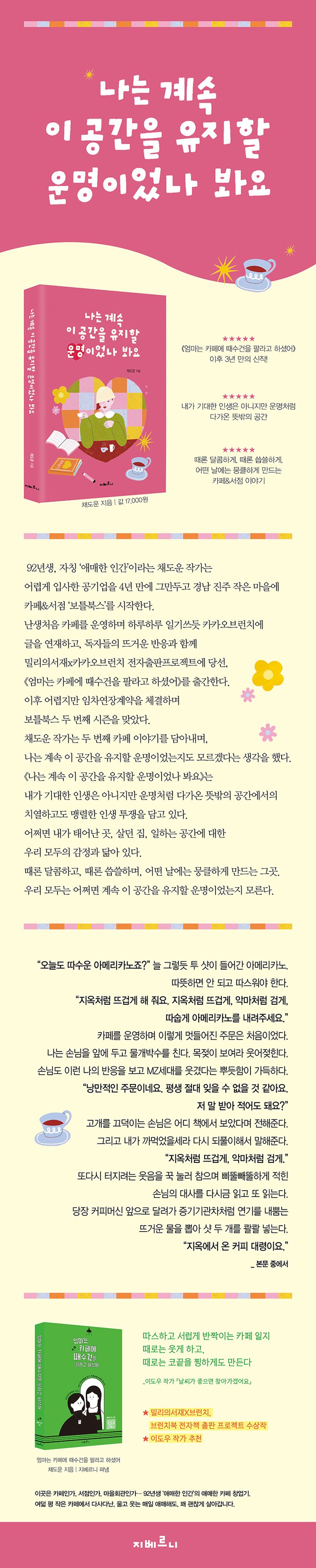 이후 어렵지만 임차연장계약을 체결하며 보틀북스 두 번째 시즌을 맞았다. 채도운 작가는 두 번째 카페 이야기를 담아내며, 나는 계속 이 공간을 유지할 운명이었는지도 모르겠다는 생각을 했다. 《나는 계속 이 공간을 유지할 운명이었나 봐요》는 내가 기대한 인생은 아니지만 운명처럼 다가온 뜻밖의 공간에서의 치열하고도 맹렬한 일상 투쟁을 담고 있다. 어쩌면 내가 태어난 곳, 살던 집, 일하는 공간에 대한 우리 모두의 감정과 닮아 있다. 때론 달콤하고, 때론 씁쓸하며, 어떤 날에는 뭉클하게 만드는 그곳. 우리 모두는 어쩌면, 계속, 그렇게 각자의 공간을 유지할 운명이었는지 모른다.