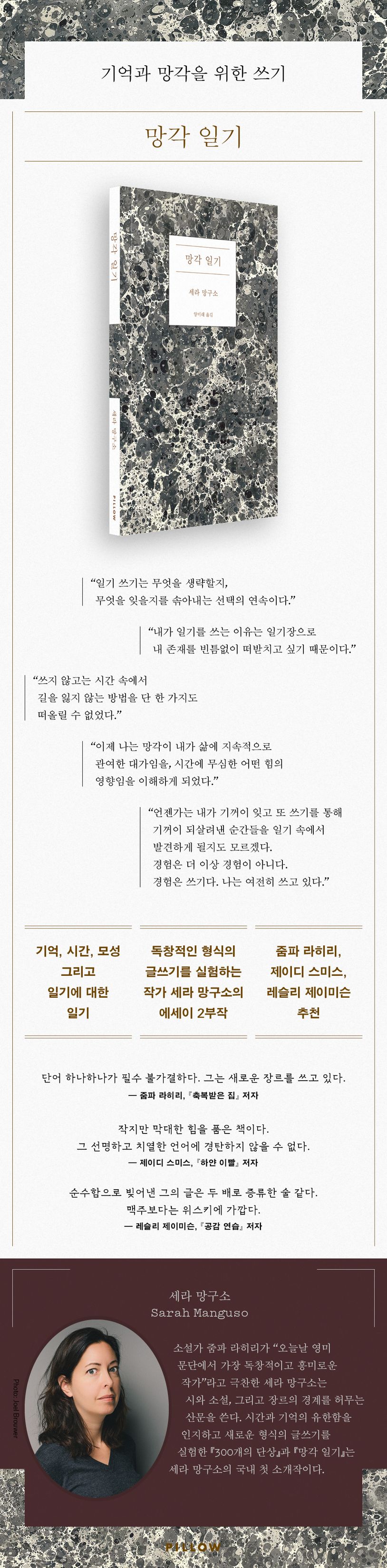 세라 망구소는 25년 동안 집요하게 일기를 썼다. 죽음과도 같은 망각에 저항하며 기억과 시간의 흐름을 박제하고 싶었기 때문이다. 이윽고 그는 임신을 하고 아이를 낳았다. 출산과 육아는 그가 일기와, 그리고 자기 자신과 맺어온 관계를 뒤바꾼 기념비적 사건이었다. 『망각 일기』는 글쓰기, 모성, 필멸성, 시간과 기억에 대한 고군분투가 담긴 아름답고 과감한 작품이다.