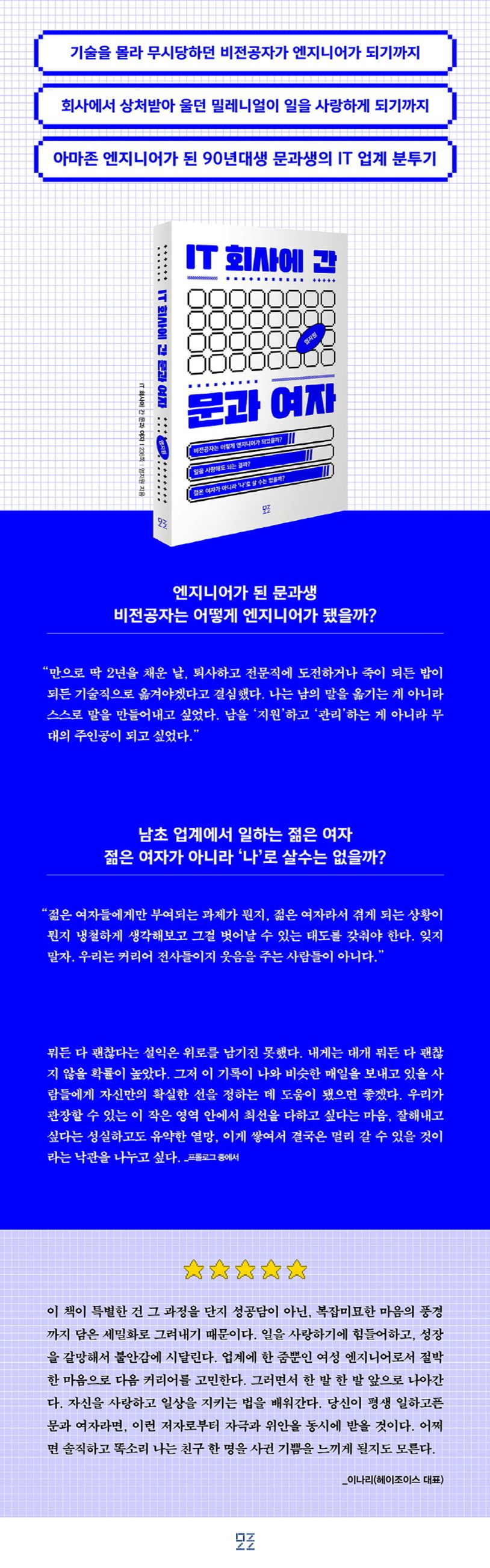 뼛속까지 문과생은 어떻게 아마존 엔지니어까지 될 수 있었을까? 한비야와 반기문을 롤모델로 삼고 ‘가슴을 뛰게 하는 꿈을 찾으라’는 메시지를 계시처럼 품고 살던 90년대생 문과생인 저자는, 문과생들에게 유난히 비좁은 취업문을 간신히 뚫고 외국계 IT 회사의 ‘전공 무관’ 부서에서 커리어를 시작했다. 엔지니어들을 지원하는 부서에서 기술을 몰라 무시당했던 문과생은 기술직으로 전환하겠다는 꿈을 품게 된다. 여자라서, 비전공자라서, 지금은 너무 늦은 것 같아서… 모두와 똑같은 의문을 품고 자신을 의심하던 90년대생 문과생의 IT 업계 분투기.