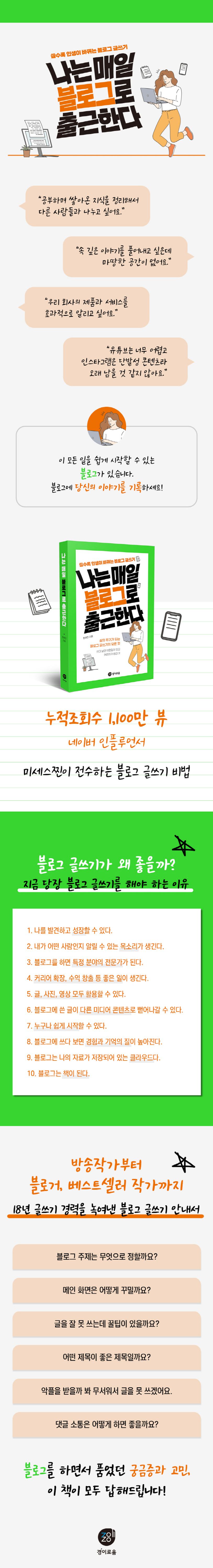 블로그 글쓰기 하나만으로 6개의 직업이 생겼다는 저자는 ”블로그 글쓰기는 내 마음을 보살펴주고 ‘나’라는 사람이 성장하도록 도와주었다. 그 매력에 빠져 산 지 7년, 내 인생은 180도 바뀌었다.“라고 말한다. 블로그 글쓰기의 즐거움을 더 많은 사람과 나누고 싶어 블로그 글쓰기 강의를 했다. 그리고 방송작가 12년, 블로그 운영 7년, 여러 권의 도서 집필까지 18년간 쌓아온 글쓰기 노하우를 집약해 이 책을 썼다.