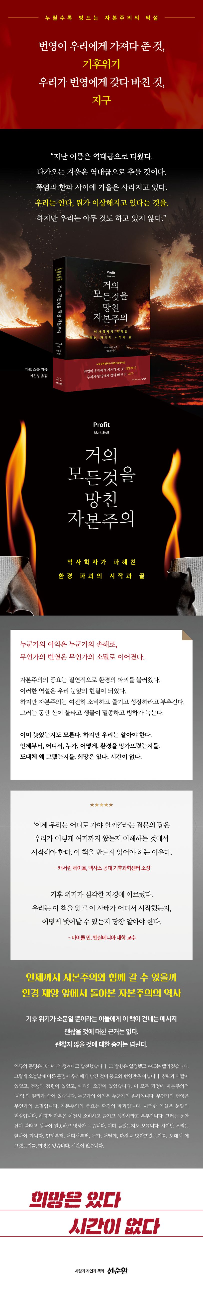 인류의 문명은 1만 년 전 생겨나고 발전했다. 그 방향은 일정했고 속도는 빨라졌다. 그렇게 오늘날에 이른 문명이 우리에게 남긴 것은 풍요와 번영만은 아니었다. 침략과 약탈이 있었고, 전쟁과 점령이 있었고, 파괴와 오염이 있었다. 이 모든 과정에 자본주의적 ‘이익’의 원리가 숨어 있다. 누군가의 이익은 누군가의 손해로, 무언가의 번영은 무언가의 소멸로 이어졌다. 자본주의의 풍요는 필연적으로 환경의 파괴를 불러왔다. 이러한 역설은 우리 눈앞의 현실이 되었다. 하지만 자본은 여전히 소비하고 즐기고 성장하라고 부추긴다. 그러는 동안 산이 불타고 생물이 멸종하고 빙하가 녹는다. 이미 늦었는지도 모른다. 하지만 우리는 알아야 한다. 언제부터, 어디서, 누가, 어떻게, 환경을 망가뜨렸는지를. 도대체 왜 그랬는지를. 희망은 있다. 시간이 없다.