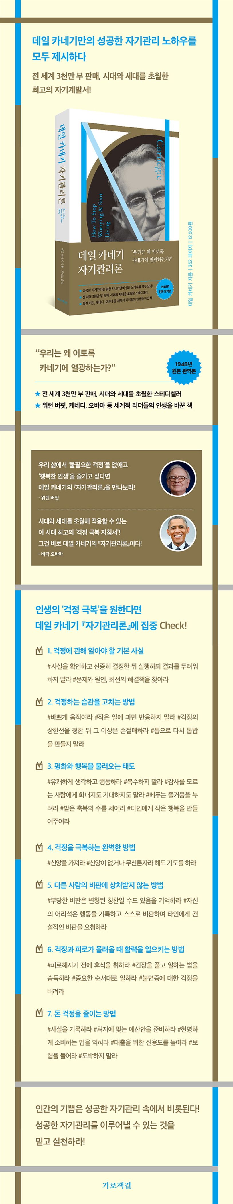 1948년 초판된 『자기관리론(How to Stop Worrying & Start Living)』은 그의 또 다른 역작 『인간관계론(How To Win Friends & Influence People)』(1936), 『성공대화론(Public Speaking & Influencing Men In Business)』(1926)과 더불어 카네기 ‘불후의 3부작’으로 꼽힌다. 세계 최초로 실시한 걱정 극복 실험과 공자에서 처칠까지 동서양을 총망라한 다양한 서적들을 참고해 탄생한, 시대와 세대를 초월해 효과적으로 적용할 수 있는 이 시대 최고의 ‘걱정 극복 처방전’이다. 일상생활에 쉽게 적용할 수 있는 구체적이고 실용적인 카네기만의 노하우를 담았다. 카네기가 건네는 조언을 습득한 독자라면 이제는 걱정이라는 딱정벌레가 더 이상 우리의 인생을 갉아먹지 못하도록 지금 당장 실행해보자. 중요한 것은 이론보다 실행이니까.
