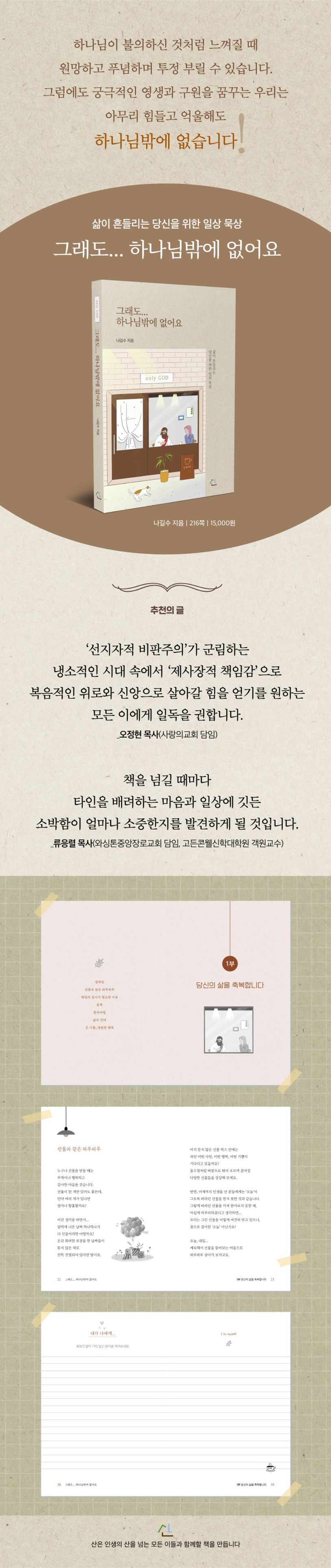 저자는 이 책을 통해 삶이 흔들리는 모든 사람들에게 이 말을 꼭 전하고 싶다. “그래도... 하나님밖에 없어요!” 아무리 억울하고 힘들어도, 무거운 삶의 현실 속에서도 다시금 하나님을 바라볼 수 있도록 말이다. 이 책에 있는 작은 글들을 읽으며 ‘그렇지! 나는 아직 소망이 있지. 못나지 않았지. 살 수 있겠다’라는 마음을 가질 수 있길, 다시금 주님 주시는 새 힘과 새 능력으로 ‘오늘’을 살아갈 수 있길 간절히 소망한다.