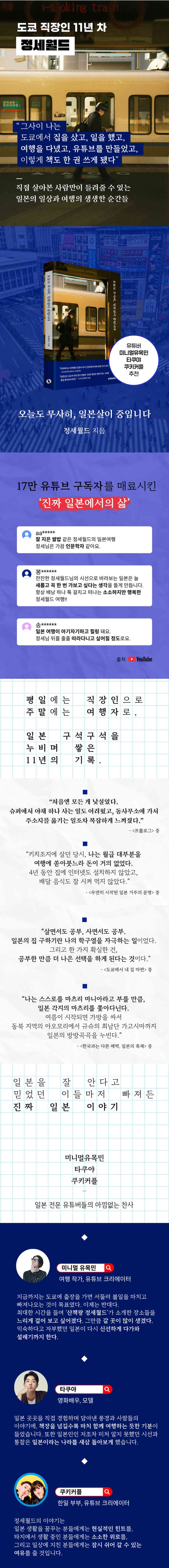 ‘일본에서 나로 살아낸 시간’을 기록한 이 책은 일본에서의 삶을 꿈꾸는 이들은 물론, ‘한 번 사는 인생, 하고 싶은 것을 하며 살아보고 싶다’는 마음을 품은 이들에게 낯선 삶을 시작할 용기를 건넨다. 그리고 무엇보다, 자신이 좋아하는 것을 향해 조금씩 나아가는 정세월드의 모습은 ‘나로서 살아간다’는 일의 의미와 즐거움을 되새기게 한다.
